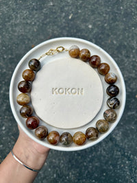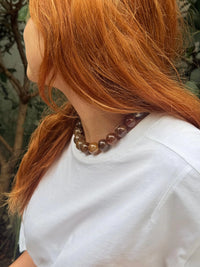 Marrones profundos con vetas naturales que atraviesan cada esfera. Acabado brillante y forma chunky que le dan carácter, peso visual y una estética sobria.