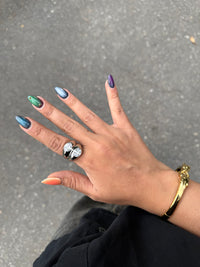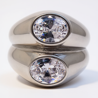 En 2025, los anillos chunky dominan la tendencia, apostando por formas robustas y llamativas. Este diseño cuenta con dos gemas centrales de corte brillante sobre una base gruesa y pulida. Elaborado en acero inoxidable 316L hipoalergénico, un material que mantiene su brillo y no se oxida con el tiempo.