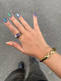 Estructura rectangular y diseño abierto. La gema purpura, también de forma rectangular, se ubica en uno de los vértices. Uno de los bordes de la piedra tiene un acabado irregular que hace que el metal parezca cubrir parcialmente esa esquina, creando un contraste entre líneas definidas y detalles más orgánicos.