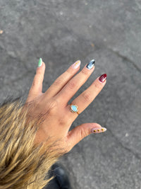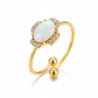 Anillo abierto en acabado dorado con una gema central tipo ópalo en la parte frontal. La rodean pequeñas gemas transparentes que aportan brillo sutil y detalle al diseño.
