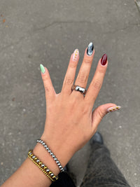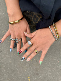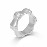 Un anillo grueso con bordes ondulados y suaves que le dan un aspecto fluido y natural. Su forma no es completamente redonda, lo que lo hace destacar con un diseño sólido y llamativo.