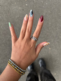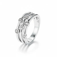 Tres líneas paralelas que se cruzan con pequeños cristales redondos, como si flotaran en su propio espacio. Un diseño delicado que sigue la tendencia de formas minimalistas con detalles sutiles y modernos.